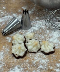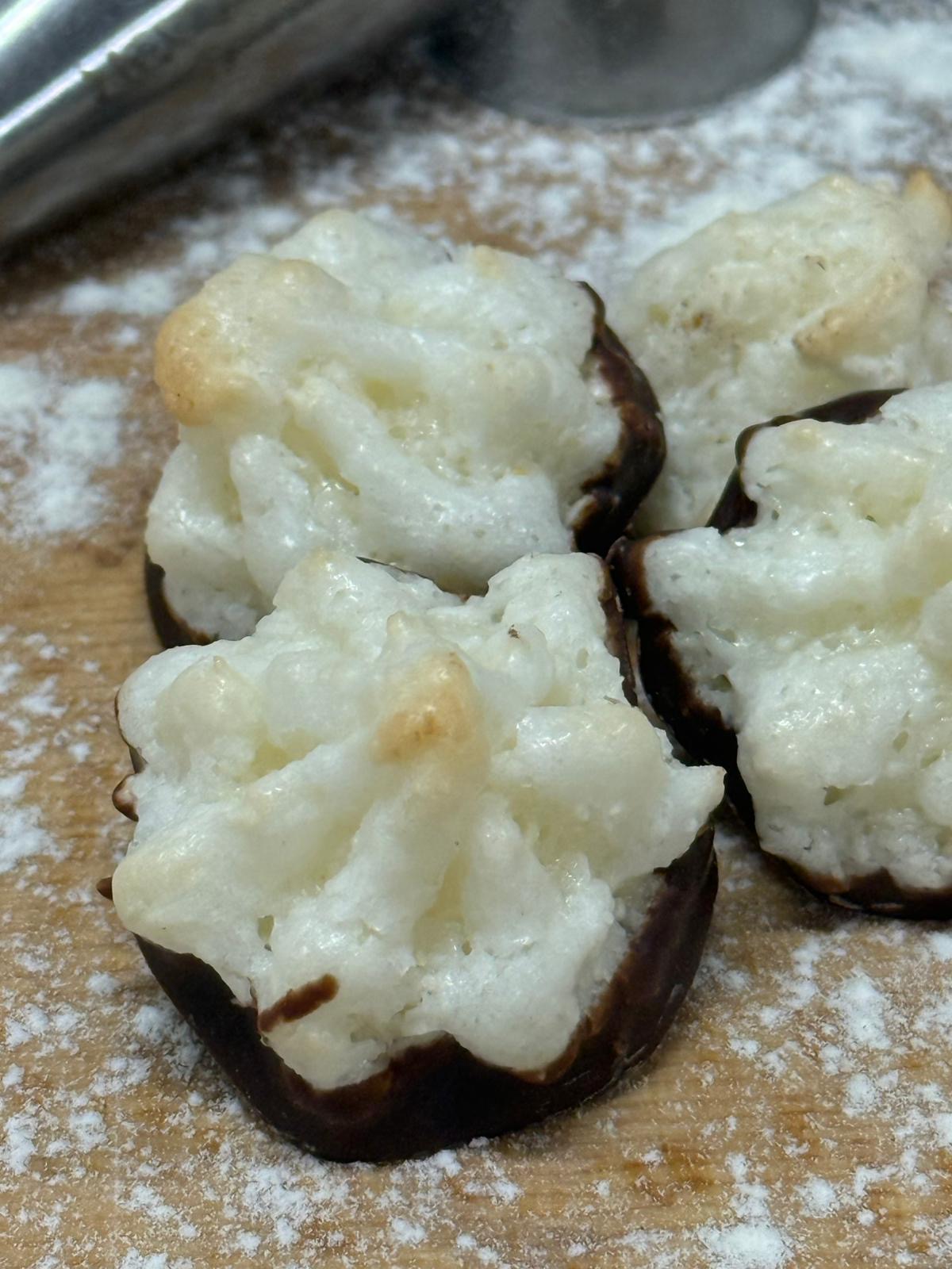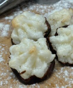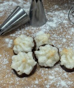 Außen zart knusprig, innen wunderbar saftig – unsere Kokosmakronen sind ein echter Genussklassiker. Mit ihrem intensiven Kokosaroma und der luftig-leichten Textur schmecken sie nach purem Glück und erinnern an den Duft frisch gebackener Weihnachtsgebäck-Tradition. Der zartschmelzende Schokoladenfuß aus feinster Kuvertüre rundet den Geschmack perfekt ab und sorgt für einen feinen, edlen Kontrast: cremige Schokolade trifft auf saftige Kokosfülle – einfach unwiderstehlich. Ein Gebäck, das man liebt, sobald man hineinbeißt: aromatisch, weich, duftend und himmlisch lecker. Perfekt zum Kaffee, Tee oder zum Naschen zwischendurch.